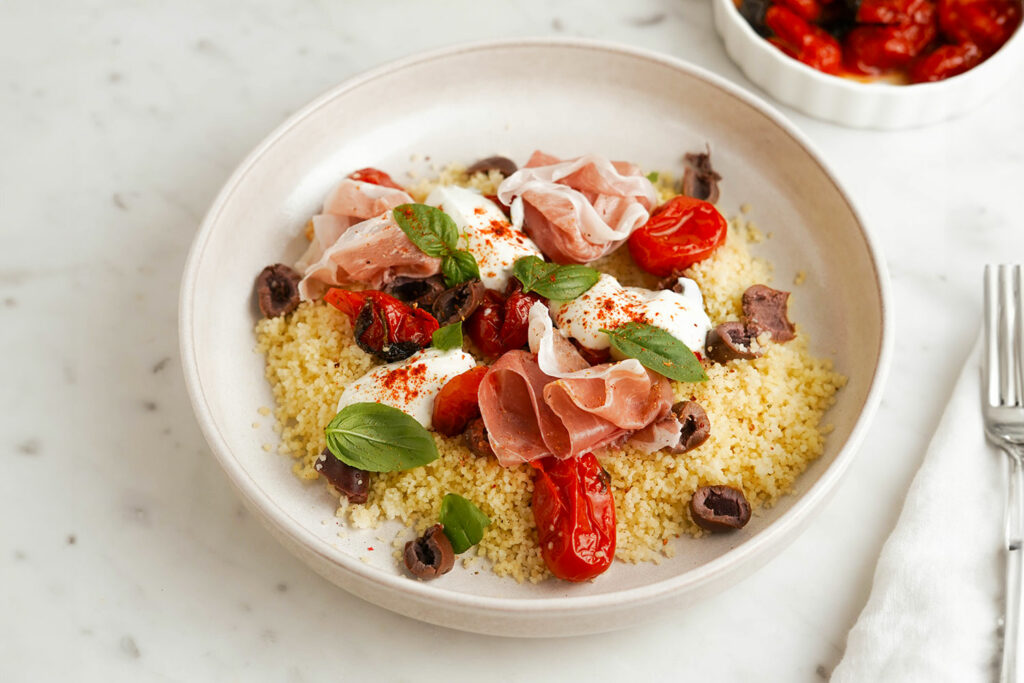 Couscous mit gerösteten kirschtomaten und San Daniele Schinken
