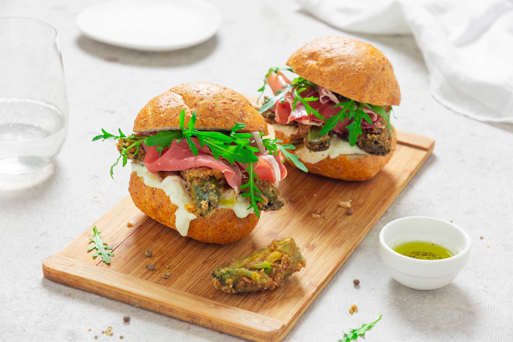 - Die Brötchen aufschneiden, mit Stracchino bestreichen und anschließend die Hälfte der Artischockenstücke darauf verteilen und mit einem Teil der Zitronette benetzen. 2 oder 3 Scheiben San Daniele Schinken darauflegen, Rucola darüber verteilen und die restliche Zitronette darauf verteilen.