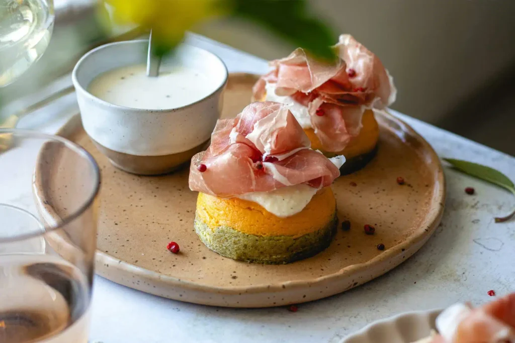 Stellen Sie sich vor, wie der fluffige Flan auf der Zunge zergeht, wie der Kontrast zwischen der Süße des Gemüses und der Herzhaftigkeit des San Daniele Schinkens zart Ihren Gaumen streichelt. Eine Harmonie aus Aromen und Gefühlen, die die Sinne in Verzückung versetzt und die Seele befriedigt. Ein Gastronomieerlebnis, das Sie direkt auf die Hügel im Friaul-Julisch Venetien führt, wo der San Daniele Schinken entsteht.
