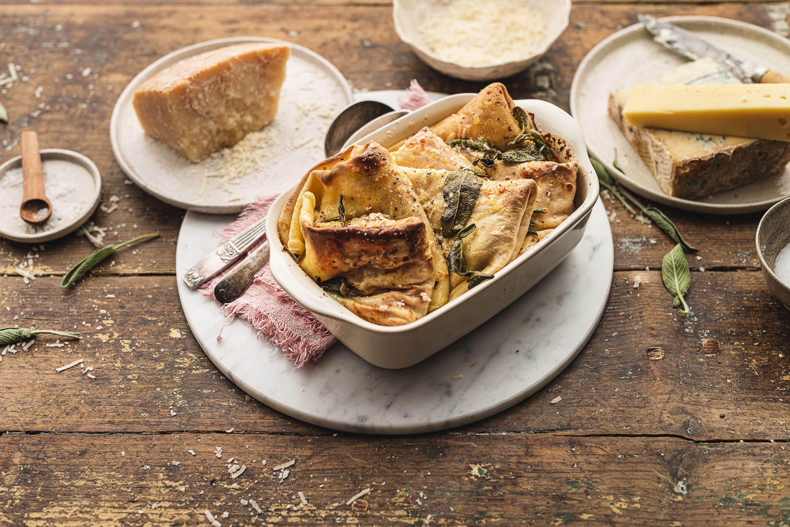 - Disporre le crepes con la chiusura verso l’alto e aggiungere qualche fiocco di burro sulla superficie. Aggiungere qualche altra fogliolina di salvia e infornare a forno statico a 200°C per almeno 15-18 minuti.
