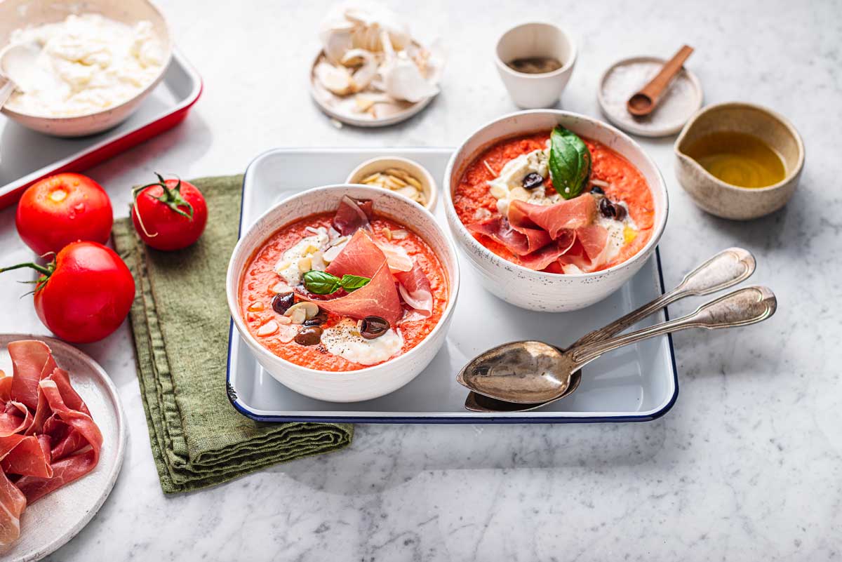 - Passato il tempo necessario per raffreddare la nostra preparazione si può procedere versando il gazpacho di pomodori e peperoni in un piatto. Successivamente aggiungere quindi le olive taggiasche, insieme alle mandorle, al basilico, alla stracciatella. Per concludere la ricetta del gazpacho col Prosciutto di San Daniele decoriamo il piatto con una fetta sottile di San Daniele ed infine con un giro d’olio EVO e qualche fogliolina di basilico fresco per completare l’impiattamento.