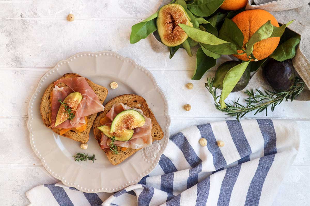 - Procedere tostando leggermente il pane di segale e spalmandoci sopra la marmellata. Infine completare la preparazione con il prosciutto crudo di San Daniele e il fico tagliato in 4.